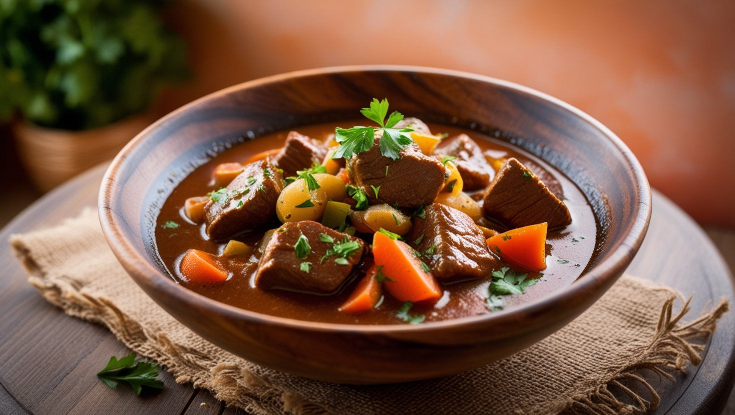 A slow-cooked stew of tender beef, onions, paprika, and potatoes — a cross between soup and stew, rich and deeply comforting.