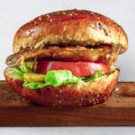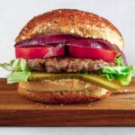Juneća pljeskavica (120g), brioche, majoneza,, ketchup, zelena salata, rajčica, kiseli krastavci