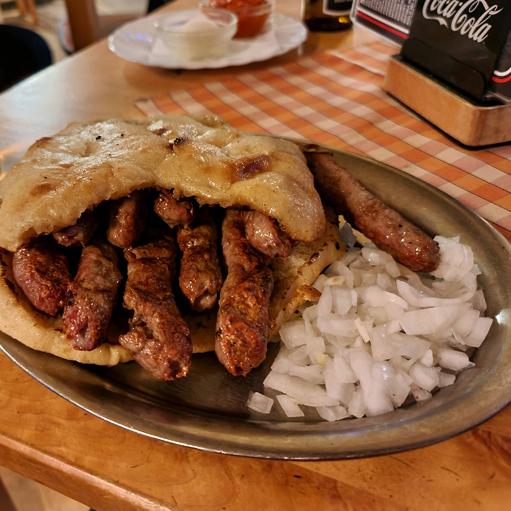5 čevapčičev, 1 špikana pleskavica, 1 sudžukica, lepinja, čebula, pijača po izbiri