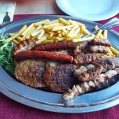 1x carsko meso, 1x ražnjić, 2x ćevap, 2x uštipak, 1x suđuk, pomfrit, tzatziki umak
