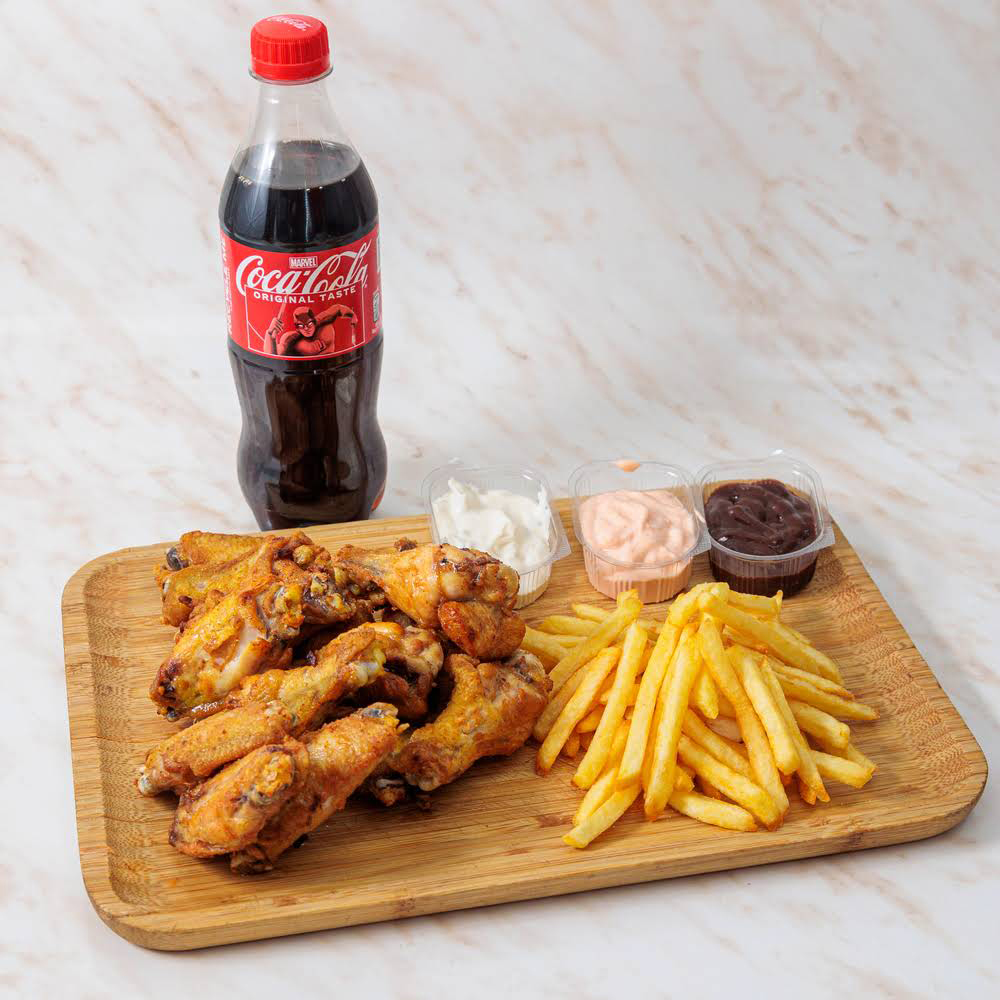 500 gr krilaca, 200 gr Pomfrit, sos po izboru 50g