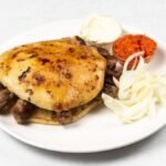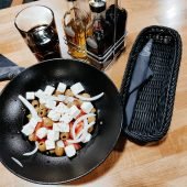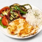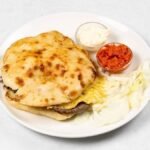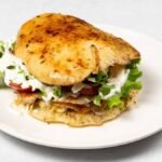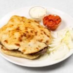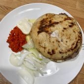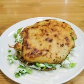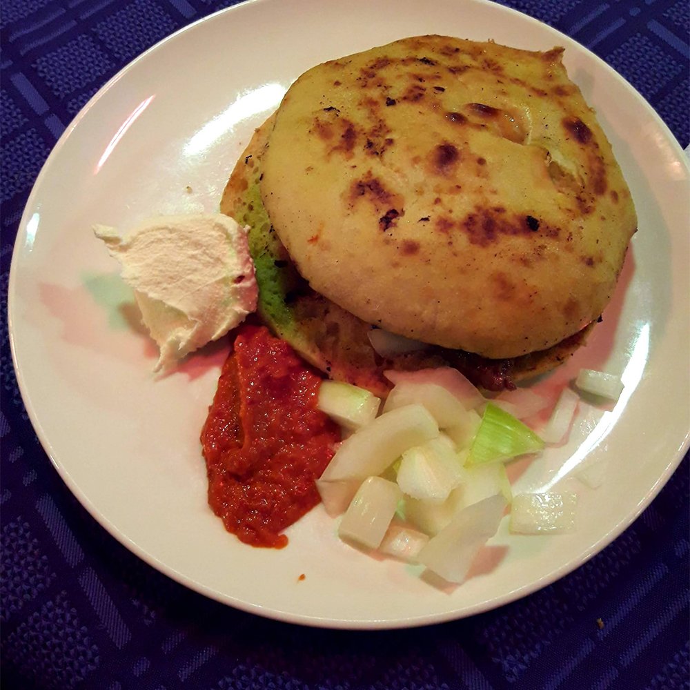 Piščančje meso, domača lepinja, domač jogurtov preliv, solata, paradižnik, stopljen sir na žaru