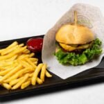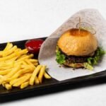 100% goveje meso, maslena bombetka, sir brie, karamelizirana čebula, solata, hišna omaka, pomfri