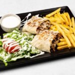 Tortilja, bučke, paprika, čebula, koruza, začimbe, paradižnikova omaka in dodatek po izbiri Priloga: solata s prelivom, pomfri in dve omaki po izbiri Spreminjanje osnove jedi žal ni mogoče