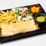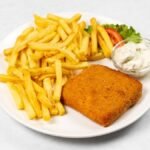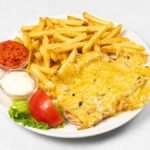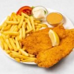 Piščančji dunajski zrezek s prilogo, majoneza in medena omaka