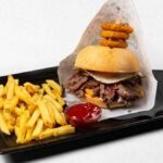 Maslena bometka, roastbeef, cheddar sir, hišna omaka, čebulni obročki, jajce, paradižnik, pomfri