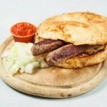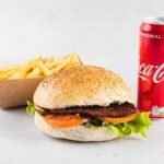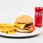 Pecivo, pljeskavica juneΔe meso, rajΔica, zelena salata, sir, umaci, pommes frites, piΔe po izboru *slika je simboliΔna