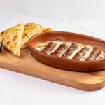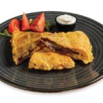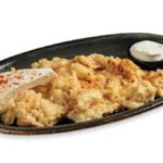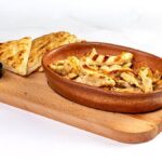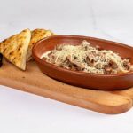 Marinirana teletina 250g, krem sos sa kajmakom, rendani kaΔkavalj, somun, tucana paprika