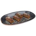 Stek od lososa 200g, domaΔinski krompir 100g, senf-med sos, marinada od belog luka, somun