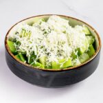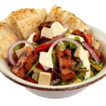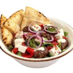 Miks salata 100g, peΔena paprika, ljubiΔasti luk, feta sir 60g, Δevapi 100g, krem sos sa kajmakom, tucana paprika, somun