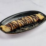 Marinirano pileΔe meso 250g, senf, somun, pomfrit 200g, 1 palaΔinka sa kremom i mlevenim keksom