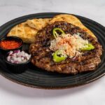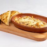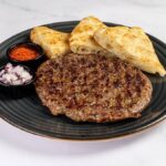 JuneΔe meso zaΔinjeno crnim i belim lukom 250g, krem sos sa kajmakom, rendani kaΔkavalj, tucana paprika, somun