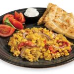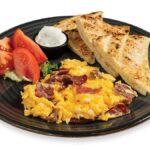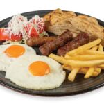 2 peΔena jajeta, Δevapi 50g, sudΕΎuka 60g, paradajz sa feta sirom, pomfrit 100g, somun