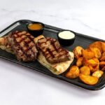JuneΔe meso 250g, domaΔinski krompir 100g, aceto-balsamico sos, senf-med, krem sos sa kajmakom, somun