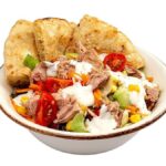 Miks salata 100g, Ε‘argarepa, kukuruz, Δeri paradajz, krastavac, tunjevina 110g, tartar sos, somun