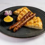 Tradicionalni Δevapi od Δistog juneΔeg mesa 125g, krem sos sa kajmakom, slatka mlevena paprika, somun, luk