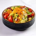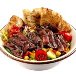 Miks salata 100g, Ε‘argarepa, kukuruz, Δeri paradajz, krastavac, ramstek 125g, aceto balsamico sos sa medom, somun