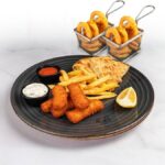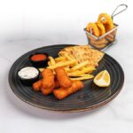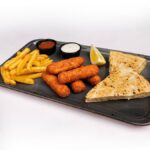 SoΔni, hrskavi pilecΜi zalogaji 150g, pomfrit 100g, keΔap, tartar sos, hrskavi kolutovi luka 200g, somun