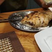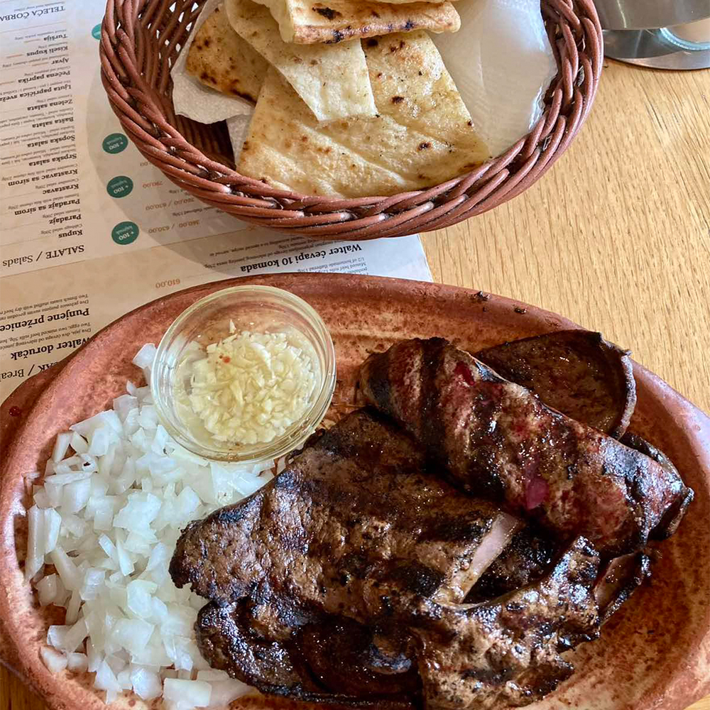 Tradicionalni Δevapi od Δistog juneΔeg mesa 250g, 1/2 somun, pomfrit 200g, 1 palaΔinka sa kremom i mlevenim keksom