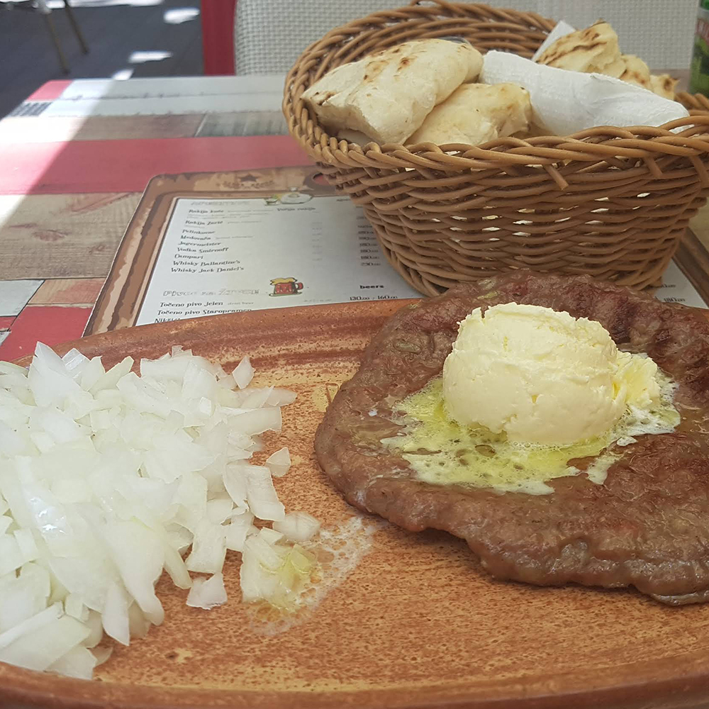 JuneΔe meso zaΔinjeno crnim i belim lukom 250g, krem sos sa kajmakom, rendani kaΔkavalj, tucana paprika, somun