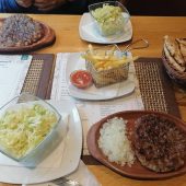 2 peΔena jajeta, Δevapi 50g, sudΕΎuka 60g, paradajz sa feta sirom, pomfrit 100g, somun