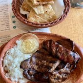 RaΕΎnjiΔ od ramsteka 125g i dimljene piletine na Ε‘tapiΔu 125g, domaΔinski krompir 100g, senf-med sos, luk, somun